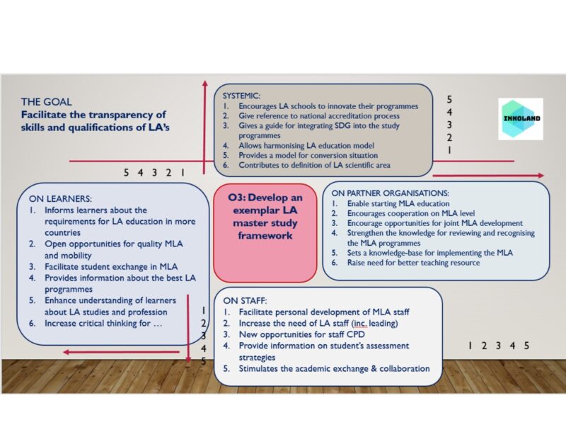 The report presents the starting points for a master level study, a set of educational modules, either compulsory or elective, serve as building blocks of the programme. Each description of a module contains the competences, aim, learning objectives, activities, teaching modes, assessment modes, and references. The didactic approach (§ 2.4) is based on a constructivist learning concepts, with studios and project work as core elements, and pedagogic functions such as problem-based learning and self-regulated design learning. In section 2.5. it presents a way to integrate landscape research into master programmes and a possibility to combine this with participatory action research. InnoLAND explored various alternatives for master programmes in landscape architecture which you can find in chapter 5. The chapter on conversion masters (chapter 6) discusses the development of a programme for learners who did not complete a bachelor programme in landscape architecture. We hope you will benefit from our work on this exemplar master programme